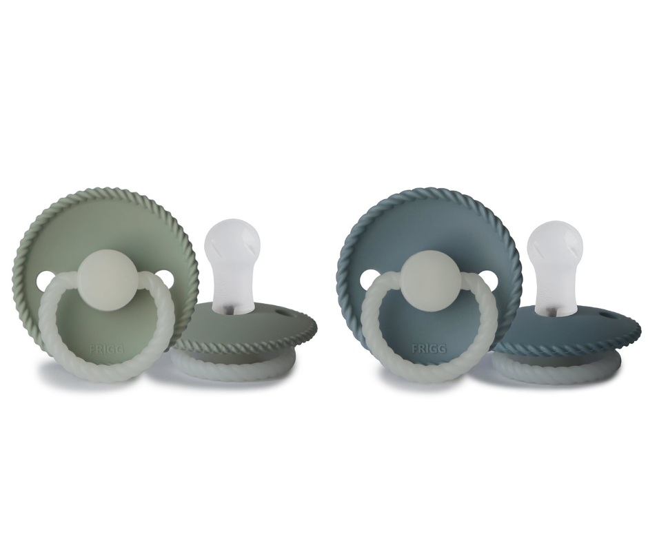 FRIGG Night pacifier with a glow-in-the-dark function. The handle and knob will glow in the dark and solve the challenge of finding and placing your baby’s pacifier in the middle of the night.The glow-in-the-night feature is softly bright and won’t harm your baby’s eyes and you can easily find the pacifier without turning on the lights.
