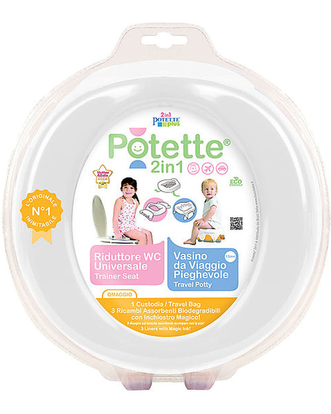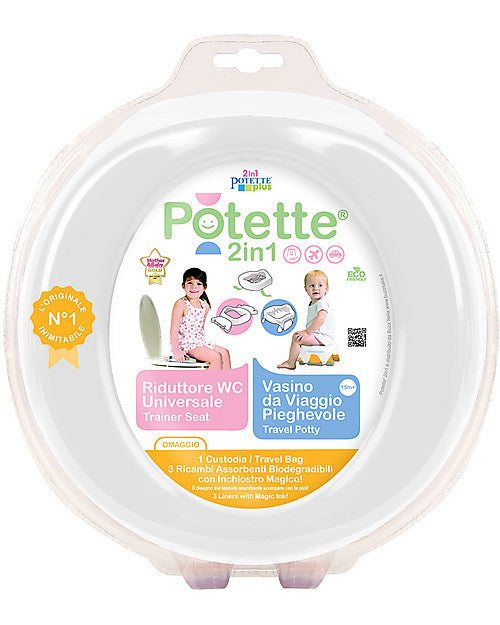 Potette 2 in 1 is a Travel Potty and Reducer , an ally of traveling parents to teach the baby to detach from the diaper even outside the home. Thanks to the 2 in 1 design, this very useful product acts both as a potty - also equipped with perfumed spare parts with handles and carrying bag - and as a reducer, to be placed on a normal toilet to allow it to be used by the baby. Ideal for traveling, on vacation, in the park, camping, on the beach, in public toilets! Practical, light, functional: to always carry with you!
