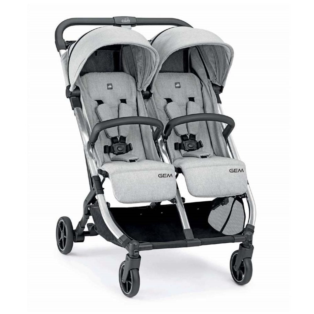 The Gem twin stroller by Cam is the ideal lightweight twin stroller for accommodating twins or two children close in age. Gem is suitable for children from birth months up to over 4 years with an approved maximum weight of 22 kg.