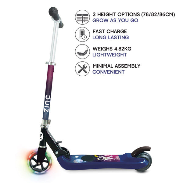 The Zinc Folding Electric E4 Spaceman Scooter is perfectly designed as a first electric scooter. The E4 is simple and easy to use, all your child has to do is simply push off and press down on the foot pad to go!