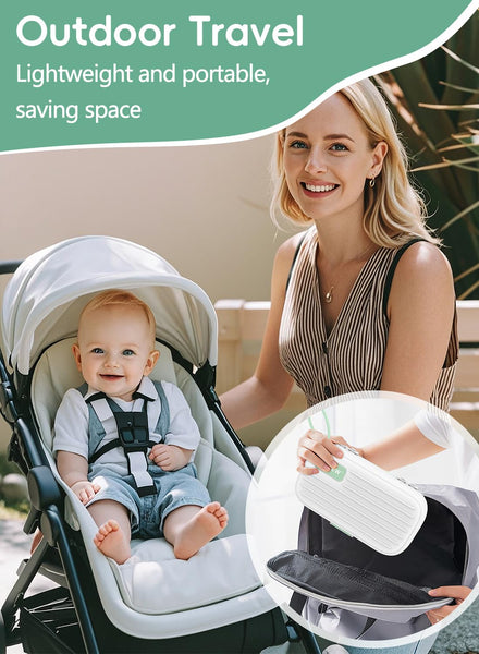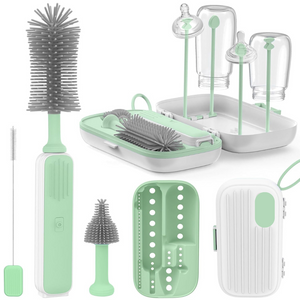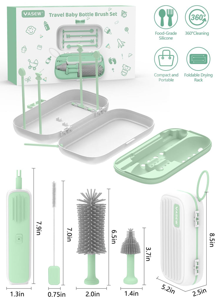 The Rockabye Portable & Baby Travel-Essential: baby bottle brush set has a small, lightweight storage box with a pull ring. Also includes a drain rack and drying rack, which doesn’t take up countertop space—ideal essential for travel and outdoor use.