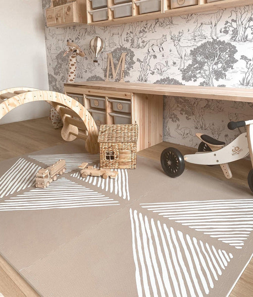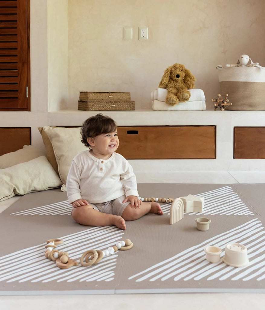 After baby, our playmats are the perfect addition to your home. Cushioned, wipe-clean and effortless style. Our Prettier Puzzle Playmats add glamour to your play space. Change the tiles around to create different looks. Our Sandy Lines pattern offers our signature, hand-drawn white lines. This design gives a modern, urban look to your floor space. Stone is a crowd-pleasing light and neutral grey. It's a colour that never goes out of fashion.