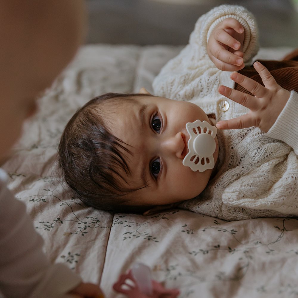 FRIGG Lucky is a symmetrical pacifier with a slightly flattened and teardrop-shaped nipple. The symmetrical pacifier always fits correctly in baby’s mouth, regardless of whether it is facing up or down. The pacifier is designed with a flatter neck to reduce the pressure on palate, gums, and also reduce the risk of crooked teeth and a crooked bite. The orthodontic design is perfect for supporting the proper development of baby’s teeth, jaw, and palate.