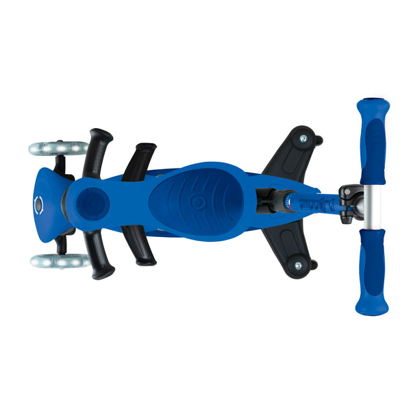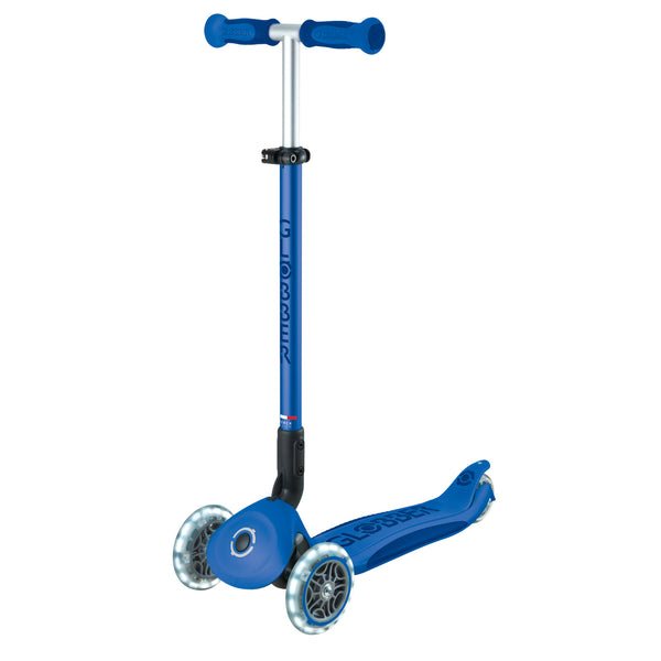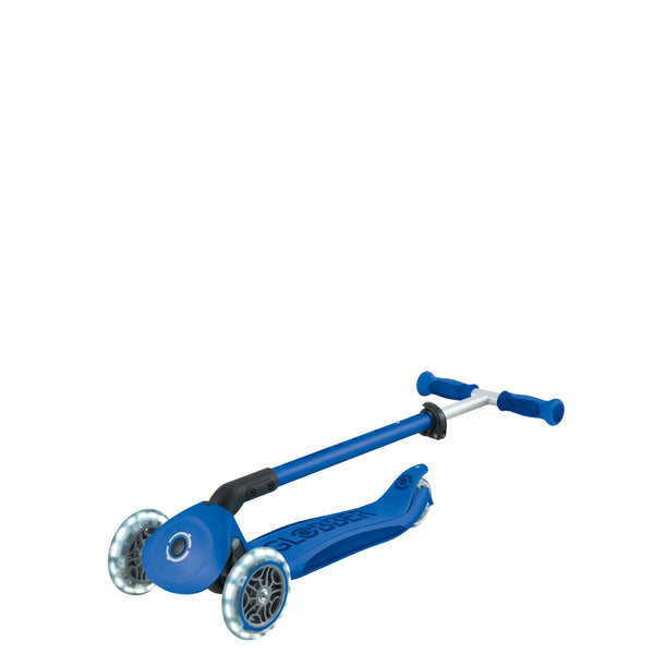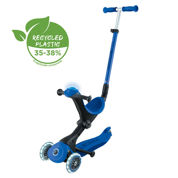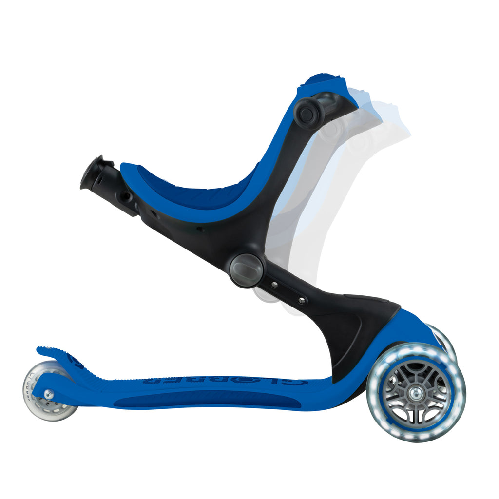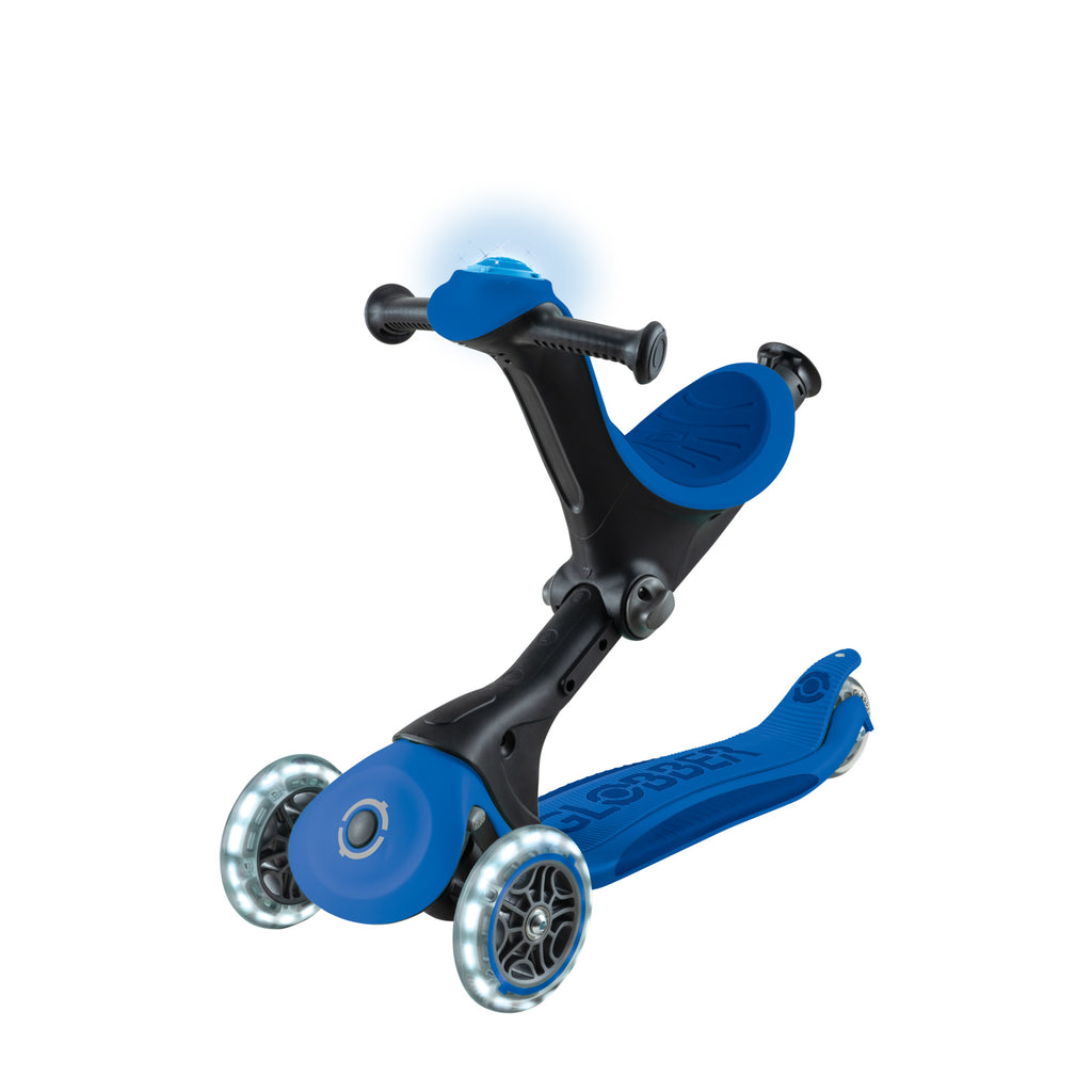 GO•UP DELUXE LIGHTS is also a foldable toddler scooter with seat, coming with our patented folding system with a push button, for a safe and easy way to store the product when in scooter mode.