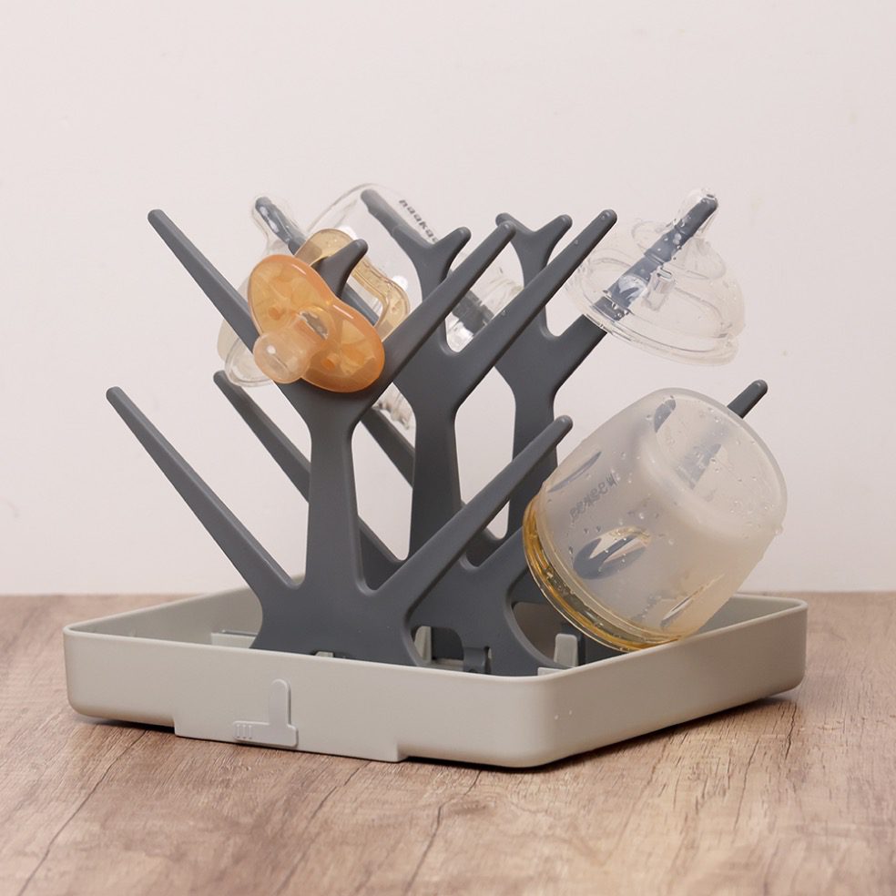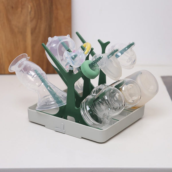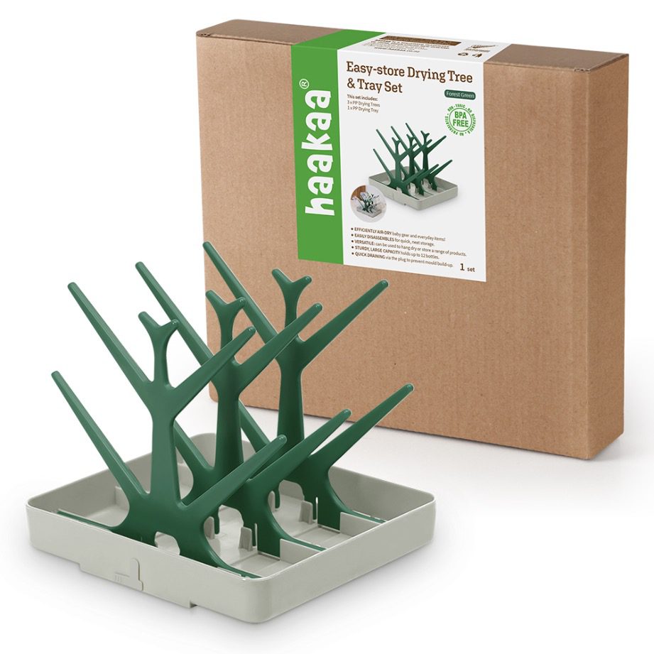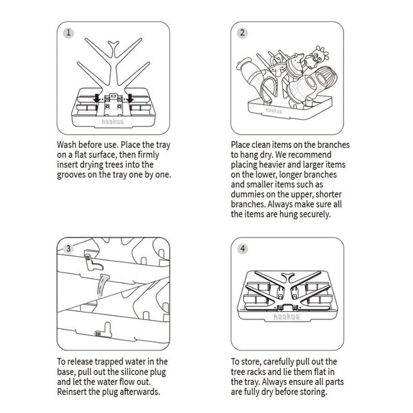 Dry your baby gear or everyday items with the Easy-store Drying Tree and Tray Set by Haakaa! Simply slot each of the three trees into the sturdy base, wash your bottles, dummies, pumps or any other everyday items, and hang them on the tree to air dry. The plug allows water to drain away with ease while the trees nestle into the base after use, making storage easier than ever.