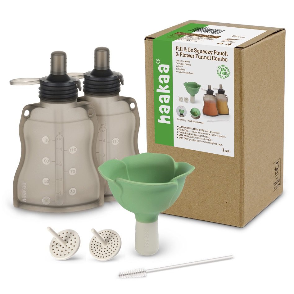 Enjoy snacks at home or out and about thanks to the Haakaa Fill & Go Squeezy Pouch & Flower Funnel Combo! Including two pouches plus our handy-dandy Silicone Flower Funnel and two detachable strainers to help filter those lumpier meals this combo makes it a breeze to get ready and head out the door. Each pouch comes with a sippy spout and straw letting your little one feed themselves at their own pace, building up those all-important independent self-feeding skils. The dedicated cleaning brush keeps the funnel stem clean and hygienic, while the pouch has a wide opening to let you quickly rinse and scrub it after use.