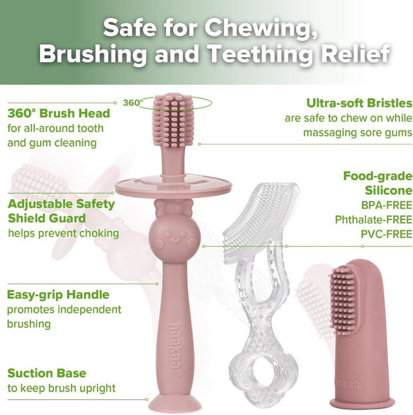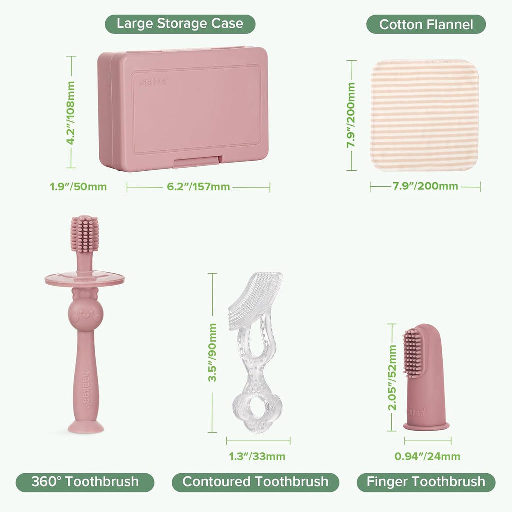 Start teaching your little one important dental hygiene habits with Haakaa’s Infant Oral Care Kit! This set includes three different brushes for your baby’s teeth as they grow, as well as a cotton flannel and a handy storage case to keep everything in.
