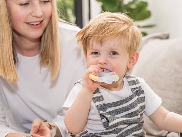 Give your baby a helping hand on their teething journey with our Haakaa Silicone Palm Teether! Each teething finger has a unique ridged design to massage sore gums and pops of colour to encourage sensory development. The super-soft yet flexible silicone allows strong little hands to twist and pull without the risk of snapping or breaking. Pop it into the freezer to provide added cooling relief!
