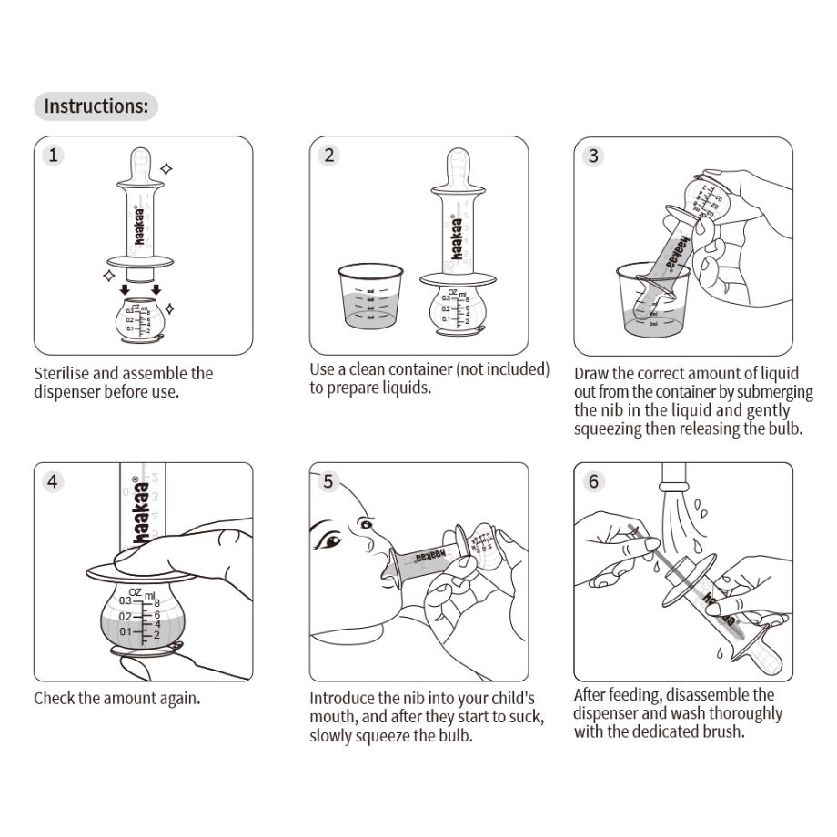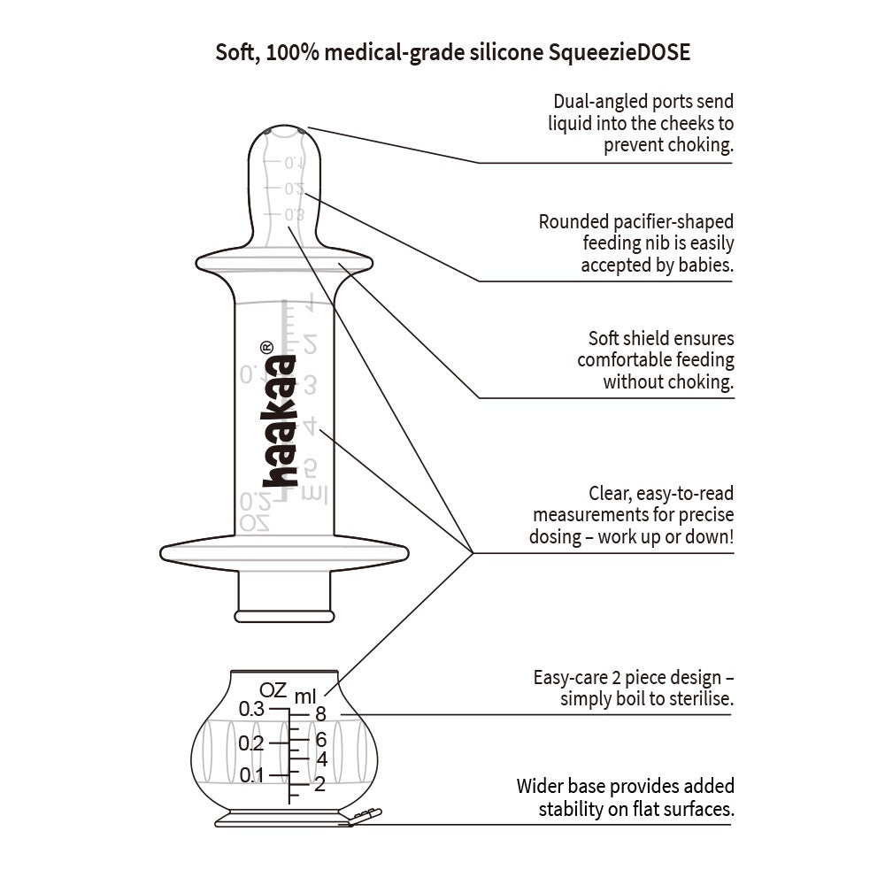 Administer medications and feed liquids to your little one safely and easily with Haakaa’s new SqueezieDOSE Silicone Dispenser! The unique silicone bulb design is an excellent alternative to traditional hard plastic syringes. It allows you to use it one-handed, giving you effortless control over the flow rate with a simple squeeze.Measurement now is more precise to 1ml. This dispenser is specially designed to allow fuss-free measuring, filling, and feeding. The wider base gives added stability on flat surfaces. The Haakaa SqueezieDose Silicone Dispenser stands out as the sole product in the market crafted exclusively from medical-grade silicone and featuring a patented design.