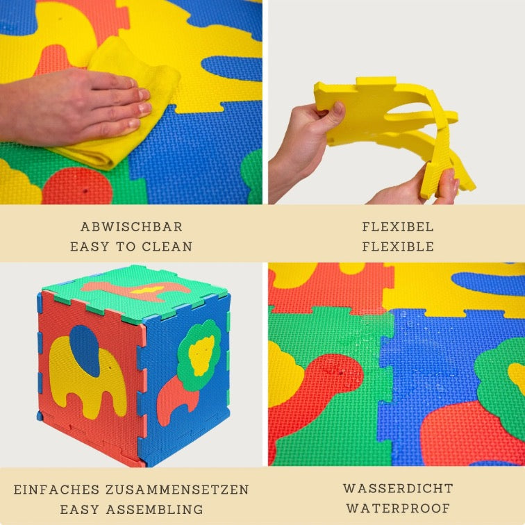 This fun, high quality Puzzle Play Mat with safari animals by Hakuna Matte will keep your child busy playing, crawling and learning colours and shapes. 12 tiles and 14 edges complete each set. The playful animal puzzles in beautiful, child-friendly colors promote the development of motor skills and problem-solving skills.