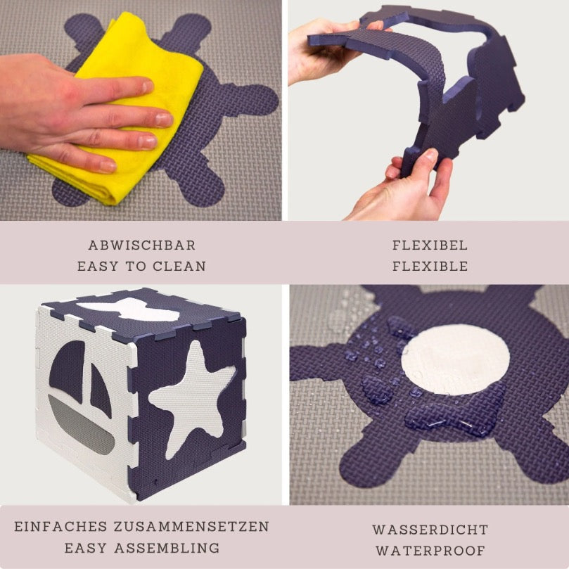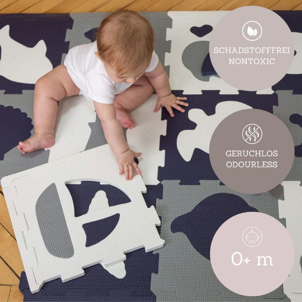 This fun, high quality Hakuna Matte Puzzle Play Mat with marine world motifs will keep your child busy playing, crawling and learning colours and shapes. 12 tiles and 14 edges complete each set. The delightful puzzles in beautiful, child-friendly colours promote the development of motor skills and problem-solving skills.