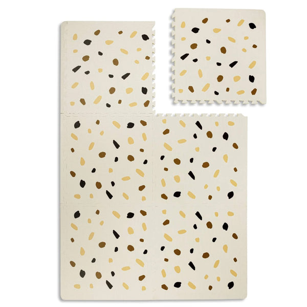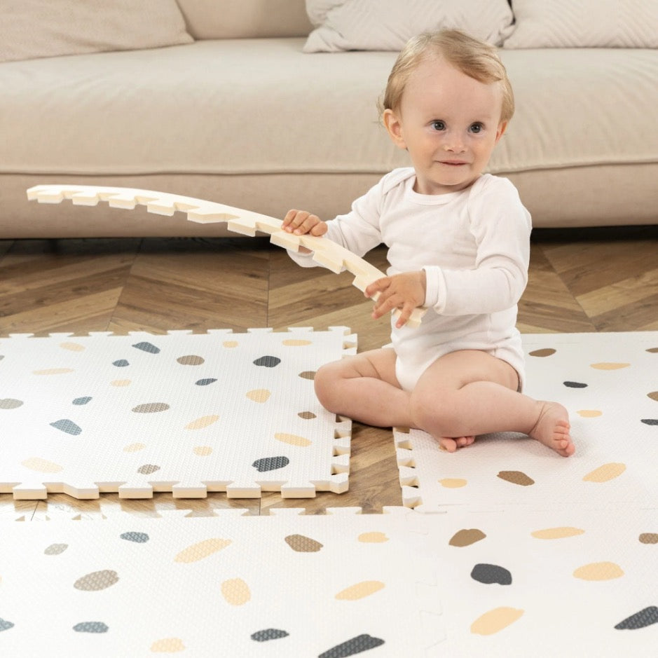 This stylish, high quality extra large play mat by Hakuna Matte consists of 6 foam squares 60x60cm – four times the size of conventional panels. 10 edges complete the set. Perfect for crawling, playing, home yoga, fitness or outdoor use. Thanks to stylish pastel colours and elegant hand-drawn confetti motifs, this mat will complement any room style.