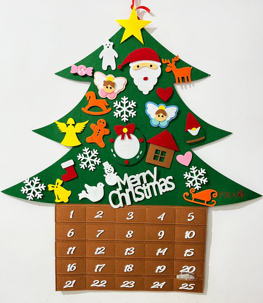 The PIRA Christmas Tree felt Advent Calendar comes with velcro affixed figures that are removed from the pockets and added to the scene each day of Advent. This fun design shaped like a Christmas tree features pieces including Santa Claus, snowmen, angels, tree ornaments, toys and more. Some people also choose to include a candy or treat in each pocket for twice the enjoyment (not included). Quality craftsmanship ensure this calendar can be used year after year. For an extra festive feel it also includes LED lights!