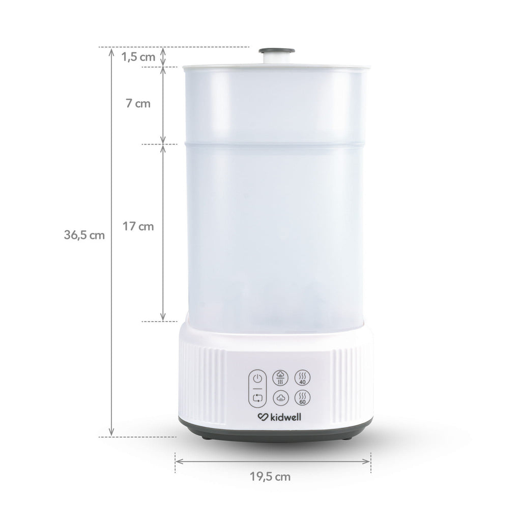 The Kidwell Puro is a versatile 2-in-1 steam steriliser and dryer designed to make daily baby care safer and easier. Using only 90 ml of water, it eliminates up to 99.9% of bacteria in just 10 minutes—without the need for any chemicals—making it a quick, eco-friendly solution for disinfecting bottles and accessories. Its large capacity includes two modular compartments: a spacious container that holds up to five bottles and a smaller one ideal for feeding and care items. You can mix and match the containers depending on your needs.