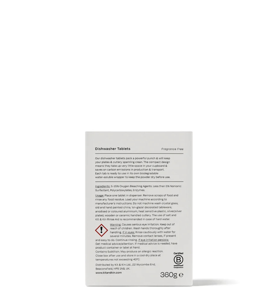 Our Kit & Kin dishwasher tablets pack a powerful punch and will keep your plates & cutlery sparkling clean. The compact design means they take up very little space in your cupboard and save on carbon emissions in production and transport. Each tab is ready to use in its own biodegradable water-soluble wrapper to keep the powder dry before use.