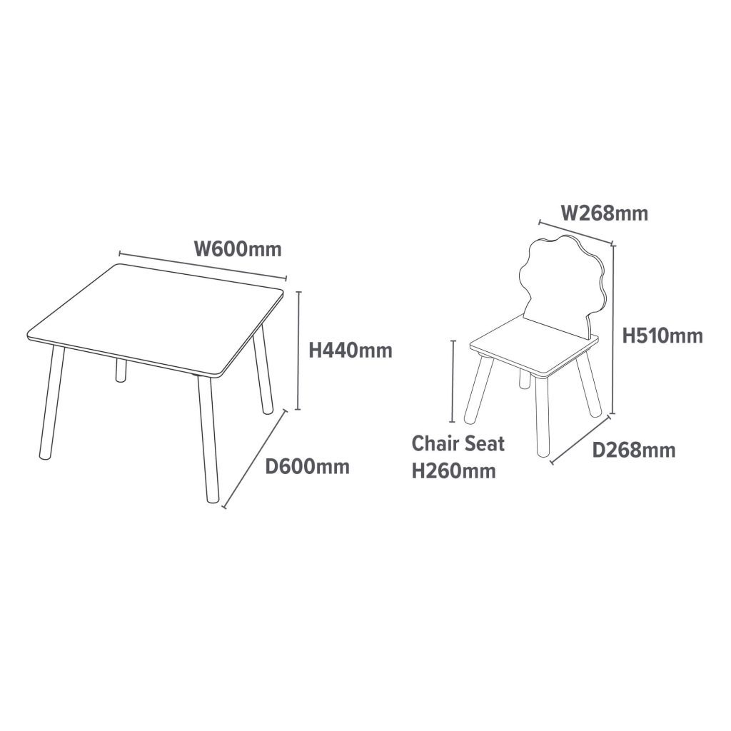 The tabletop is made from sturdy wood with solid pine wood legs for extra stability. Pinewood is known for impact resistance and so is perfect to withstand the rough and tumble of the playroom. Here, children are the key focus of everything we do. You can rest assured that your children will be safe and comfortable. The tabletop has a lacquer coating to protect against scratching, and as a result, it is easy to clean by simply using a damp cloth. With rounded corners for additional safety.