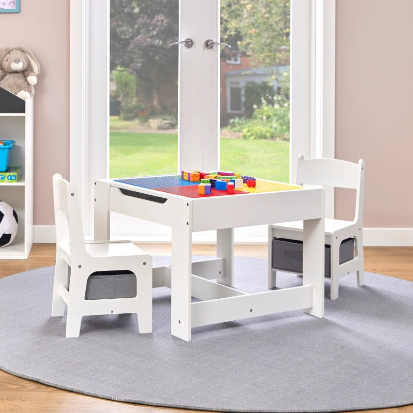 The white table and two chair set includes two slide-out grey woven fabric storage boxes that are within the chairs. This solid white wood table comes with a reversible table top offering children hours of endless fun. On one side, there is a smooth dry-wipe white board surface suitable for drawing, painting, and writing while the other side has a construction surface which can fit all leading construction brick brands. There are cut out holes to easily change the tabletop. There is also plenty of room for storage for all your kids’ pens, pencils, small toys etc.