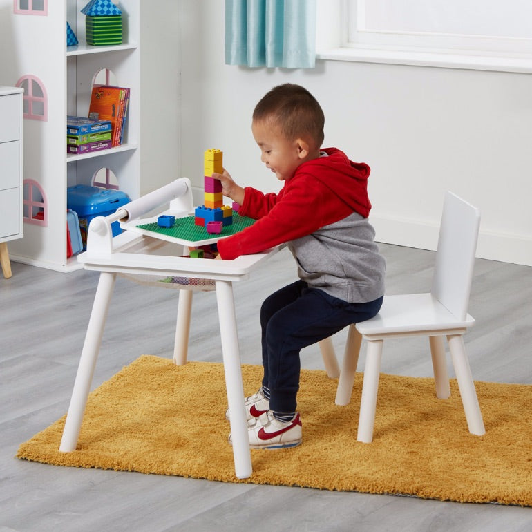 This white activity table comes with a reversible tabletop, one side is smooth ideal for eating, writing, and playing. Then flip it over to reveal a construction tabletop for children who love to build. Liberty House construction tabletops are compatible with all leading brick brands.