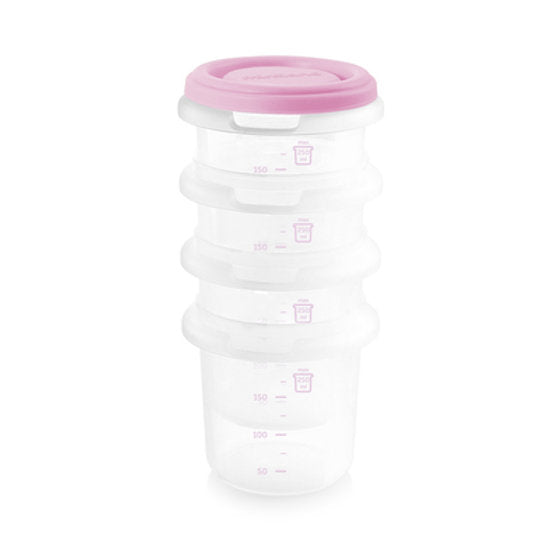 Airtight containers with 25cl capacity made in Spain with highly-resistant materials. The measurements printed on the cup allow the babies meals to be adapted to their needs at any time. Very suitable for storing breast milk, either for refrigerating or for storing for longer in the freezer. Ideal for the first mushes and all kinds of solid foods, from aperitifs and snacks to desserts.