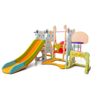 Fun children's play set from the modular series "BEAR". The set consists of a slide with a basketball hoop attached to it, a swing and a football door with an additional basketball hoop. The steps of the slide are non-slip, and the chute as well as the swing have a function for adjusting the height. For greater stability, sand or water can be placed at the base of the swing. Addition to the versatility of the set is the attractive, multicolored design and side panels in the shape of a bear. Suitable for children from 3 to 6 years of age with a maximum weight of 40 kg.