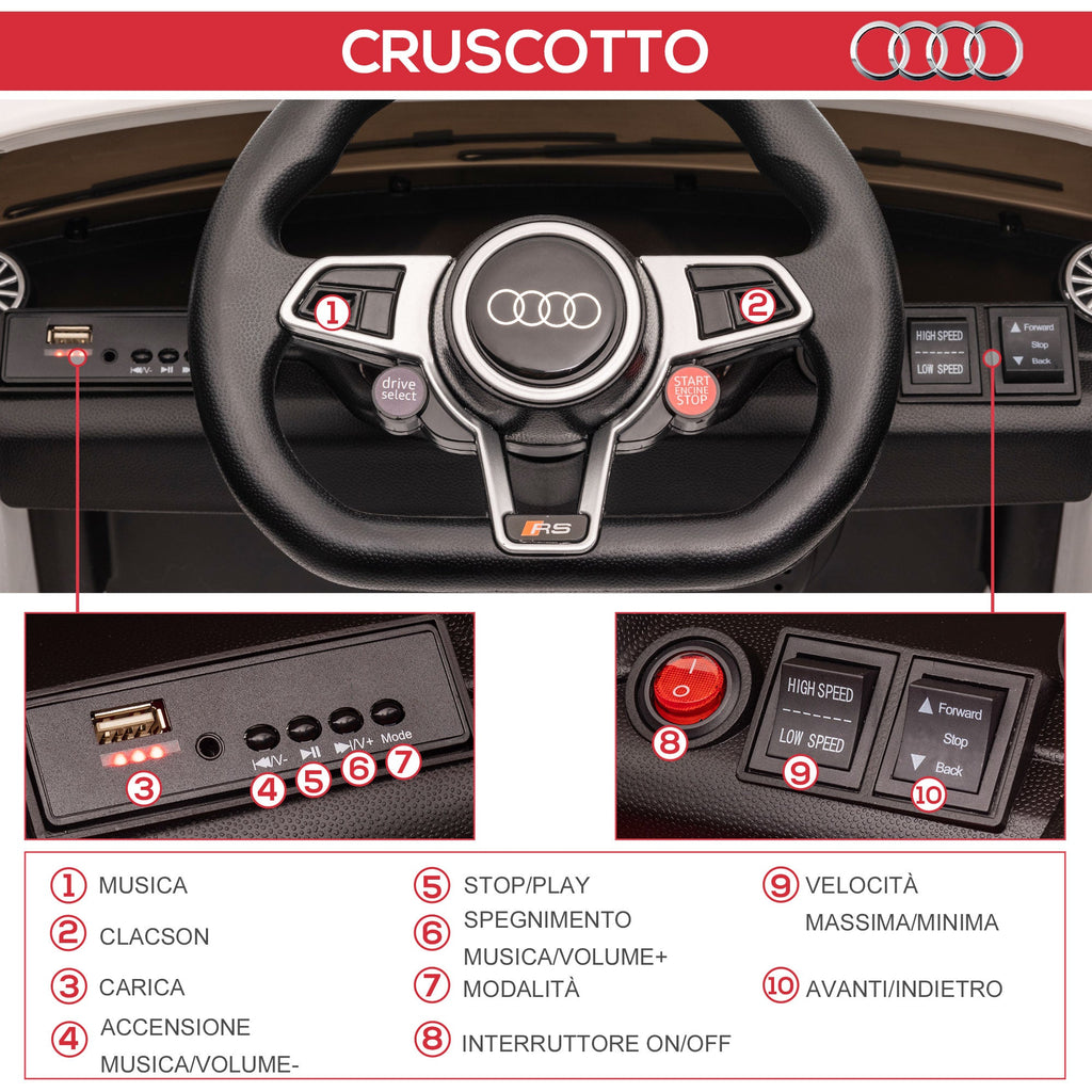 - AUDI TT LICENSE: This electric car for children is officially licensed by AUDI. Thanks to its LED headlights, horn, opening doors and integrated music, the driving experience will be realistic and safe.