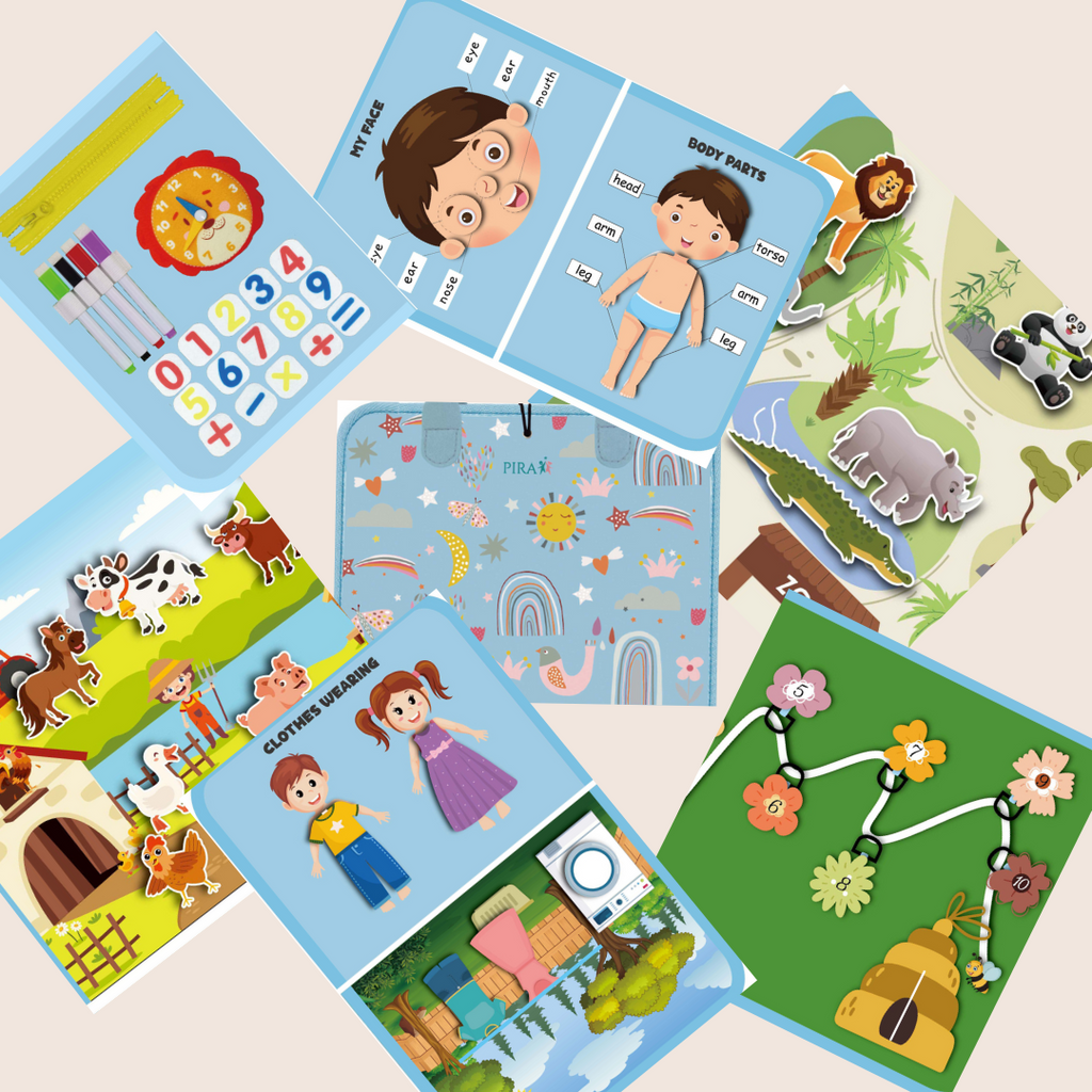 The PIRA Busy Board is a a montessori toy for toddlers to discover the world around them by touching and playing with different objects and different textures. Made using soft fabrics, lightweight, and with handles, the portable busy board book is safe and comfortable for kids to carry and play. Apart from keeping little ones busy and entertained at home, it is ideal to have while travelling in cars or on planes, and is a great alternative to screen time. Pre-school children will especially enjoy learning through this interactive toy. The quiet busy board helps them to develop a sense of self, as well as fine motor skills, in a fun way. In line with Montessori principles, the busy board book teaches children independence through various early learning life skills activities like a zipper, shoelace, buttons, and buckles. This busy board book is also an ideal sensory toy for children with autism as the various activities encourage sensory integration, fine motor skills, motor planning, cognitive development, and cause-effect understanding. It may be useful for older people too, particularly those suffering dementia, as it helps to keep their mind and hands active.
