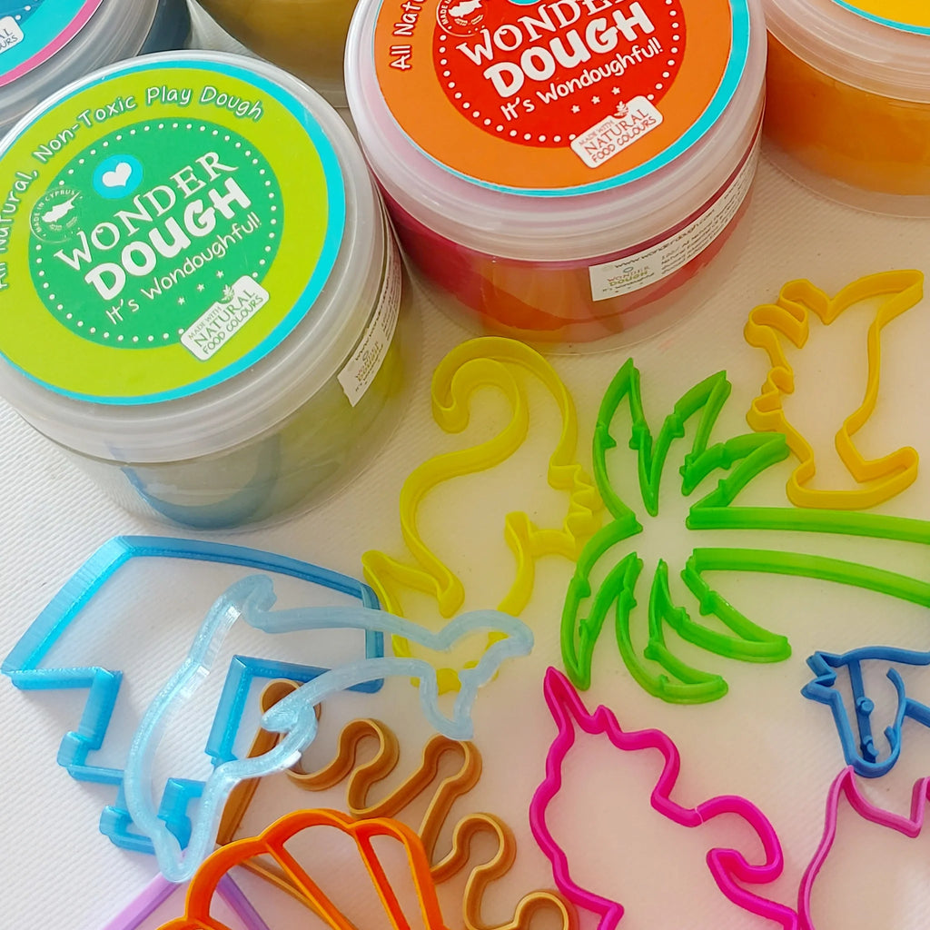 Mega package includes 680g x 8, 12 large, 12 mini cutters, 3 x sets of tools (squasher, roller, scraper, knife tool) jar of bio-plastic crafts for decorating creations, cupcake set, Waffle set, Pizza set, 10 x A4 play mats & 20 empty tubs to keep creations all come in a clear storage box.