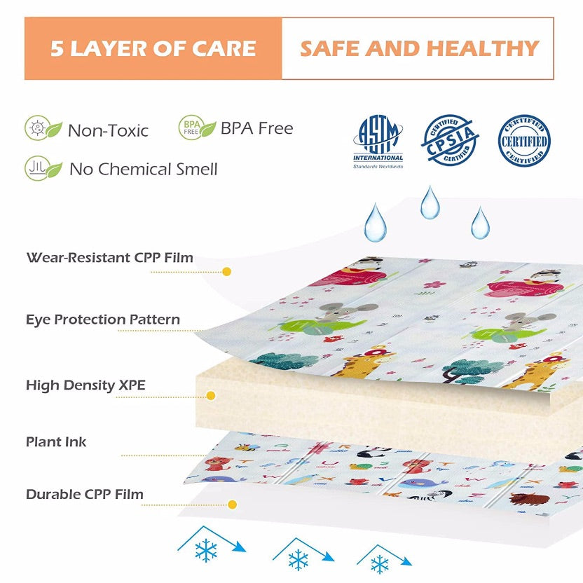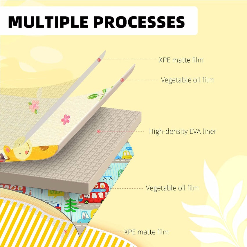 This Foldable & Reversible Extra Large Play Mat by PIRA is perfect for both indoor and outdoor use. At 200 x 180 x 1 cm, the soft and dense mat provides plenty of comfortable space for tummy time, crawling, playing, or keeping messes off your floor. Thanks to its zip close storage bag with carrying handles, this play mat may also be used for picnic outings and playtime on the go. Older children and grown ups can use it too, as a yoga or exercise mat. This 100% safe 100% safe XPE Foam play mat is BPA free, PVC free and formaldehyde free. The foam play mat is waterproof and easy to clean with a damp cloth.