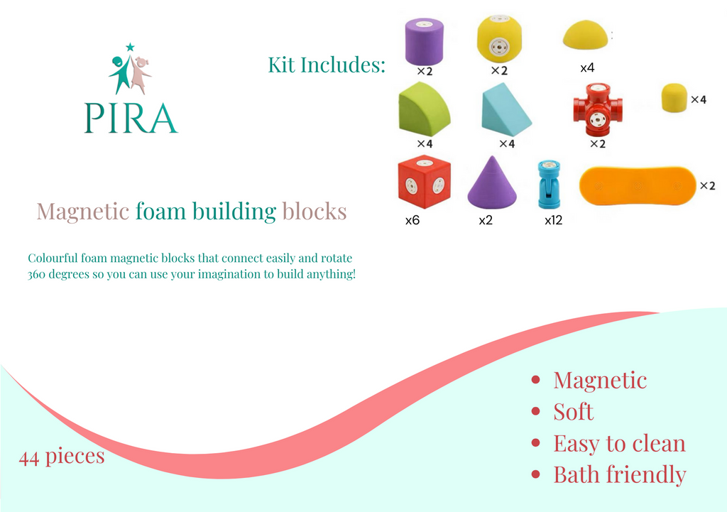 PIRA magnetic foam building blocks are soft and large size for young children to play with. Their soft material ensures safe play while their lightweight construction allows the blocks to remain attached together encouraging imaginative play.