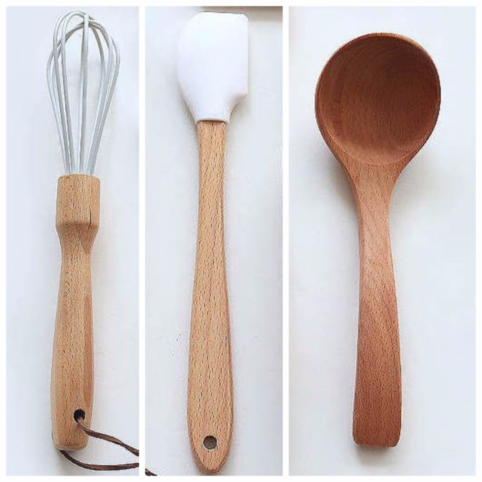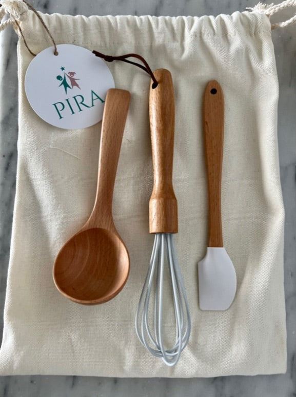 A 3 piece real wooden baking and cooking set by PIRA, including a wooden spoon, spatula and whisker, all packed in a canvas bag easy to store or carry around.