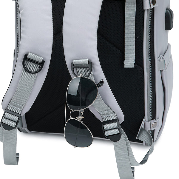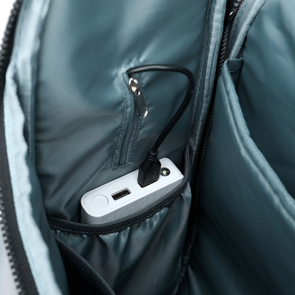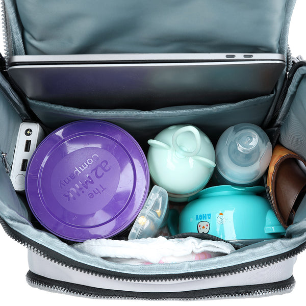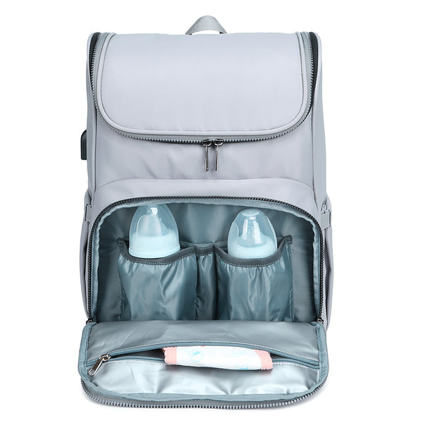 The inside of the PIRA backpack for parents includes a padded laptop pocket, 3 internal pocket organizers to hold nappies, bottles, toys, snacks, clothes, and more. It also has a quick access wipes pocket on the side and 2 insulated pockets for bottles. It includes a foldable extra thick quilted changing mat, and there is a wet and dry separation pocket to store baby's wet clothes. Integrated stroller clips are designed to turn the backpack into a stroller bag, and you can also tuck the bag onto a suitcase with the quick pass-through sleeve for easy travel. The backpack also comes with a USB interface to easily charge your mobile phone and usb-chargeable baby products. This practical backpack is made of tear-resistant waterproof fabric, strong zippers and lining. Reinforced cushioned shoulder straps and a padded back panel will distribute the weight evenly on your shoulders and back for comfortable, long time carrying.