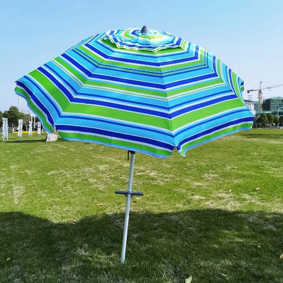 Stay protected under the sun with the PIRA Beach Umbrella, designed with UPF 50+ silver-coated polyester fabric that blocks over 99% of harmful UV rays. Its 7.5ft canopy (around 2.3m) offers generous shade, while the push-button tilt mechanism lets you easily adjust the angle up to 30° for all-day coverage. Built to last, it features 10 durable fiberglass ribsand a sturdy aluminum pole, offering excellent wind resistance even in breezy conditions. The vented top enhances airflow for added stability, and the integrated screw-in sand anchor ensures a secure setup in sand or soft ground. Whether you’re relaxing at the beach, by the pool, or in your backyard, this umbrella combines style, protection, and convenience for any outdoor setting.